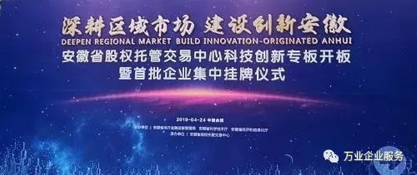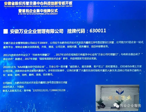2019年4月24日這一天,安徽萬業(yè)企業(yè)管理有限公司成功入駐安徽省股交中心首批科創(chuàng)板企業(yè),掛牌證券代碼:630011,這是值得被紀(jì)念的一天,是一個(gè)新的歷史上的里程碑!