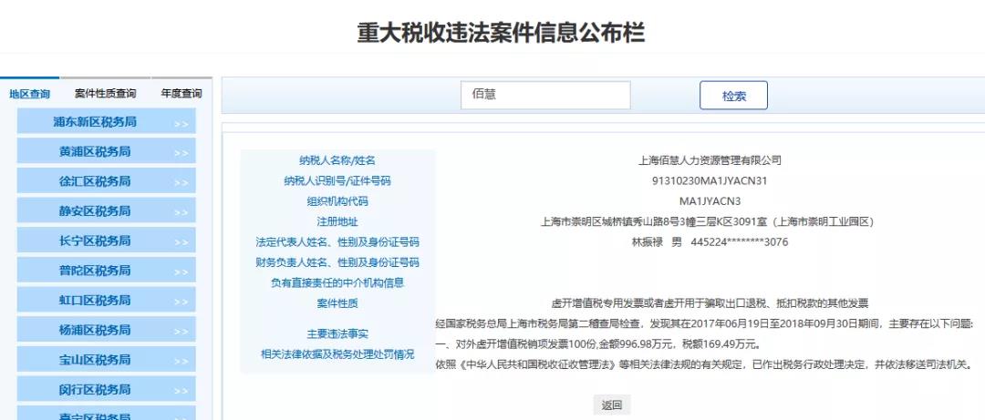 5、上海XX人力資源管理有限公司,經(jīng)國家稅務(wù)總局上海市稅務(wù)局第二稽查局檢查,發(fā)現(xiàn)其在2017年06月19日至2018年09月30日期間,主要存在以下問題:對(duì)外虛開增值稅銷項(xiàng)發(fā)票100份,金額996.98萬元,稅額169.49萬元。依照《中華人民共和國稅收征收管理法》等相關(guān)法律法規(guī)的有關(guān)規(guī)定,已作出稅務(wù)行政處理決定,并依法移送司法機(jī)關(guān)。