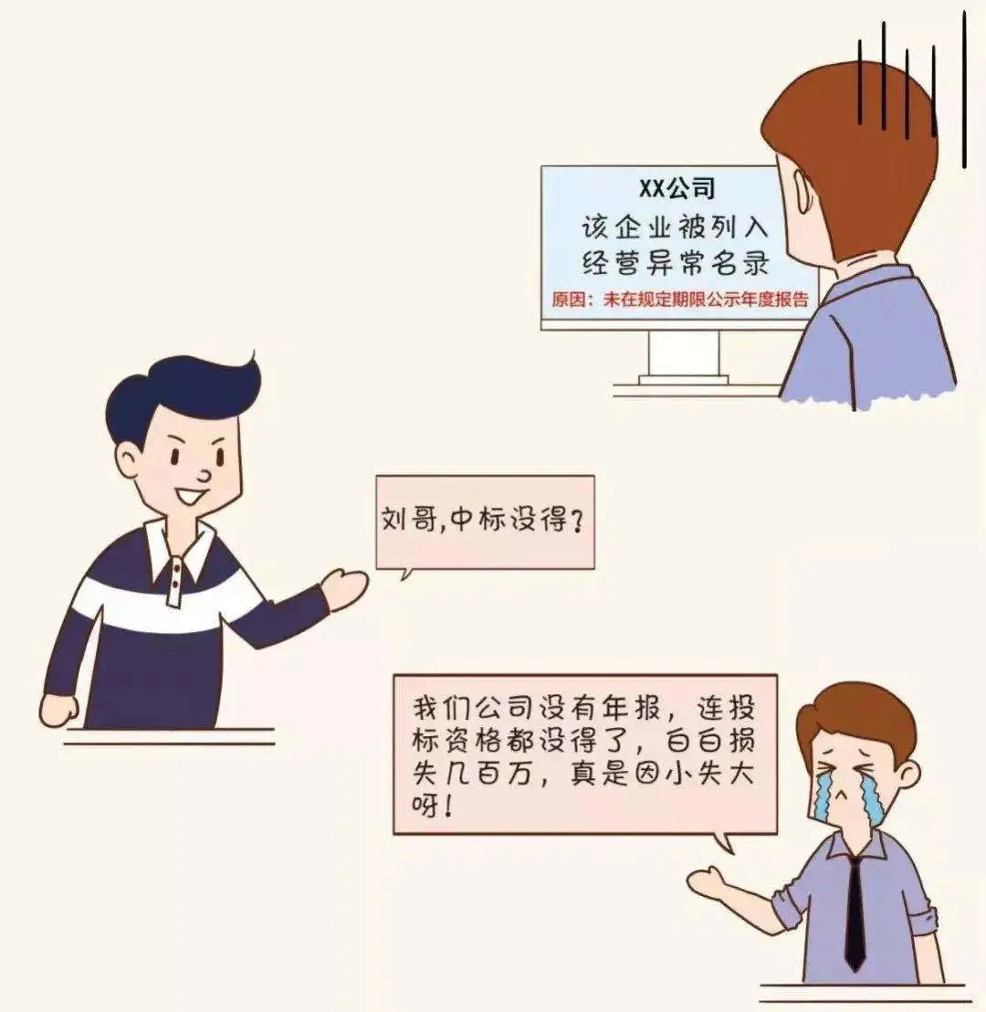 僅剩 7天 02企業(yè)合作信用受疑 現(xiàn)在是信用社會,信用對于人和企業(yè)來說都至關(guān)重要,大家都喜歡和有信用的人交往、合作。 被列入經(jīng)營異常名錄,你看看誰還找你合作! 03經(jīng)營活動受限 經(jīng)營異常名錄信息現(xiàn)在也是 銀行等金融機(jī)構(gòu)貸款、擔(dān)保等金融活動的 參考依據(jù) 老板 你好,我去年年報(bào)忘記報(bào),現(xiàn)在被列入經(jīng)營異常名錄,本來想著在阿里巴巴注冊一個(gè)網(wǎng)店,在網(wǎng)上做點(diǎn)小生意,結(jié)果被告知因?yàn)槠髽I(yè)是經(jīng)營異常名錄,注冊不了,這可怎么辦呀! 你好,首先應(yīng)在國家企業(yè)信用信息公示系統(tǒng)補(bǔ)報(bào)年報(bào),然后再準(zhǔn)備好相關(guān)材料去當(dāng)?shù)厥袌霰O(jiān)管部門申請移出哦。 小編 老板 好的,萬萬沒想到?jīng)]報(bào)年報(bào)的后果竟然這么嚴(yán)重,嚴(yán)重影響了我的經(jīng)營活動,我真是后悔莫及。 是的,企業(yè)被列入經(jīng)營異常名錄,那就有了信用污點(diǎn),必須高度重視哦!對了,2019年度的年報(bào)馬上也要截止啦,請及時(shí)申報(bào)哦。 小編 老板 2019年度的年報(bào)我們公司馬上準(zhǔn)備申報(bào)了,經(jīng)過這次,以后一定不會忘了及時(shí)年報(bào)! 建議您盡早進(jìn)行年報(bào),避免因月底網(wǎng)站擁堵或企業(yè)自身數(shù)據(jù)方面準(zhǔn)備不充分造成年報(bào)延遲。 小編 04列入嚴(yán)重違法企業(yè)名單 最最最嚴(yán)重的后果來啦! 列入經(jīng)營異常名錄三年還沒有履行信息公示義務(wù)的企業(yè),將被列入嚴(yán)重違法失信企業(yè)名單 企業(yè)五年內(nèi)不能申請移出嚴(yán)重違法失信名單,法定代表人、負(fù)責(zé)人也將受到牽連,三年內(nèi)不得擔(dān)任其他企業(yè)的法定代表人、負(fù)責(zé)人! 企業(yè)一站式服務(wù)平臺 工商注冊、財(cái)稅代賬、審計(jì)評估、稅務(wù)籌劃、商標(biāo)專利、資質(zhì)審批、人才獵頭、人才報(bào)名、金融保險(xiǎn)、信用評級、法務(wù)咨詢、項(xiàng)目申報(bào) 公司網(wǎng)站:www.gamers520.cn 聯(lián)系方式:400-0551-976 合肥總部:安徽省合肥市南一環(huán)與馬鞍山路交口恒興廣場A座24樓 分部:合肥市行政服務(wù)中心一樓“萬業(yè)公司代理窗口”(工商局窗口正對面) 分部:合肥市瑤海區(qū)行政服務(wù)中心一樓“萬業(yè)公司代理窗口”(工商局窗口正對面)