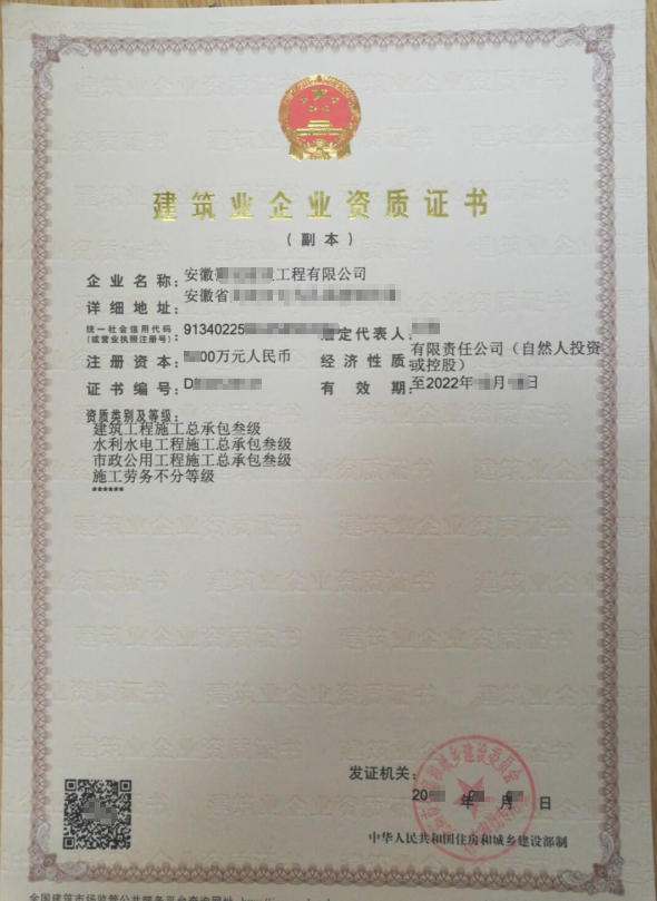 級(jí)別:建筑工程總包三級(jí)+水利水電三級(jí)+市政三級(jí)+施工勞務(wù)不分等級(jí)