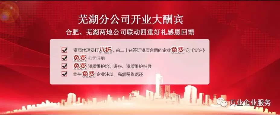 說到這里怎么能少得了優(yōu)惠活動(dòng)呢 福利時(shí)間到! 為了感謝大家長期以來一直對(duì)本司的支持 特推出開業(yè)大酬賓活動(dòng) 合肥、蕪湖兩地公司聯(lián)動(dòng)四重好禮感恩回饋??! 免費(fèi)福利 1 資質(zhì)代理費(fèi)打八折,前二十名簽訂資質(zhì)合同的企業(yè)免費(fèi)送《安許》 2 免費(fèi)公司注冊(cè) 3 免費(fèi)資質(zhì)維護(hù)培訓(xùn)講座、資質(zhì)維護(hù)指導(dǎo) 4 終生免費(fèi)企業(yè)注冊(cè)、高額稅收返還 說了這么多,快跟隨小編一睹新公司的風(fēng)采吧! 開分公司對(duì)于我們來說是挑戰(zhàn)也是機(jī)遇,挑戰(zhàn)在于外部環(huán)境,機(jī)遇在于面對(duì)挑戰(zhàn)我們?nèi)匀荒軌蚩焖偬幚聿⑶也粩嘧晕覂?yōu)化?,F(xiàn)分公司需要做的就是充分發(fā)揮我們的優(yōu)勢(shì),希望在這座城市里能夠做出更好的成績來回饋大家。謝謝大家長期以來的支持,安徽萬業(yè)才能更好的成長為大家提供更優(yōu)質(zhì)的服務(wù)!我們相信,蕪湖分公司這艘滿載著希望的巨輪,定能乘風(fēng)破浪到達(dá)成功的彼岸!